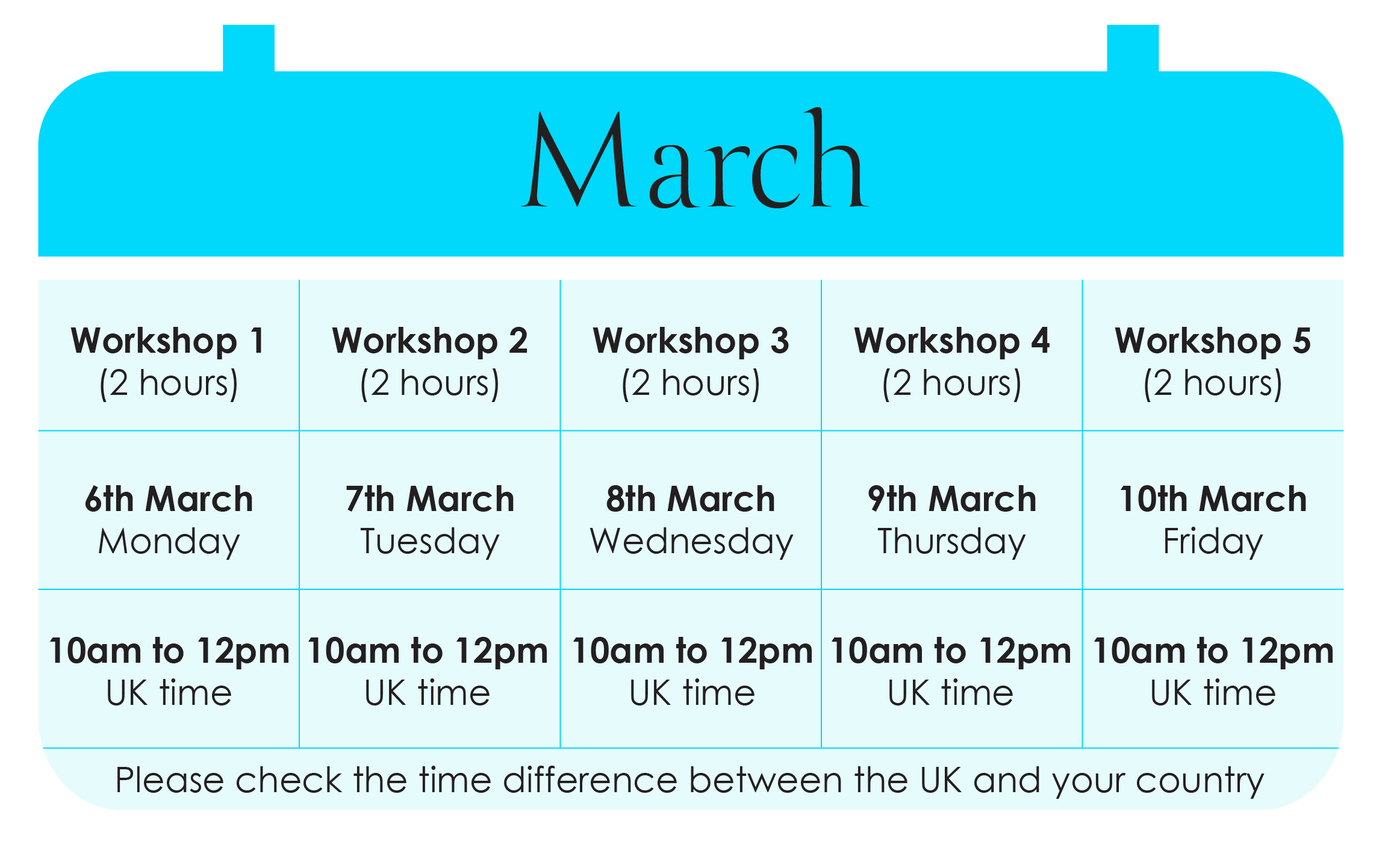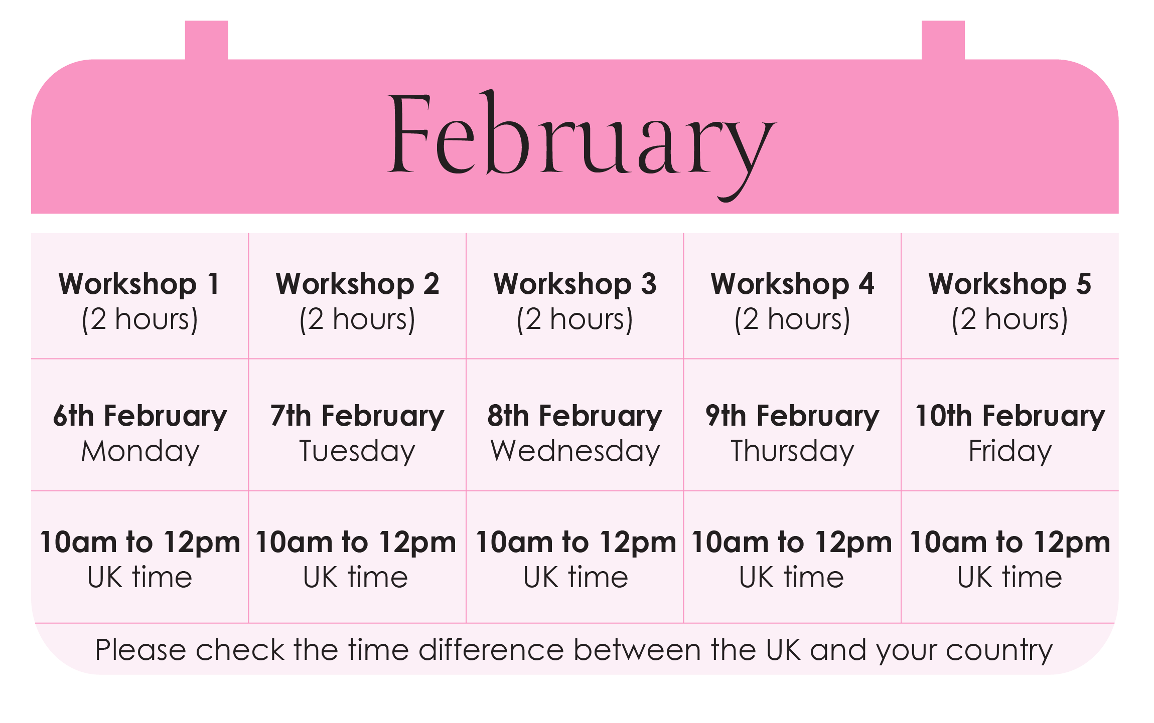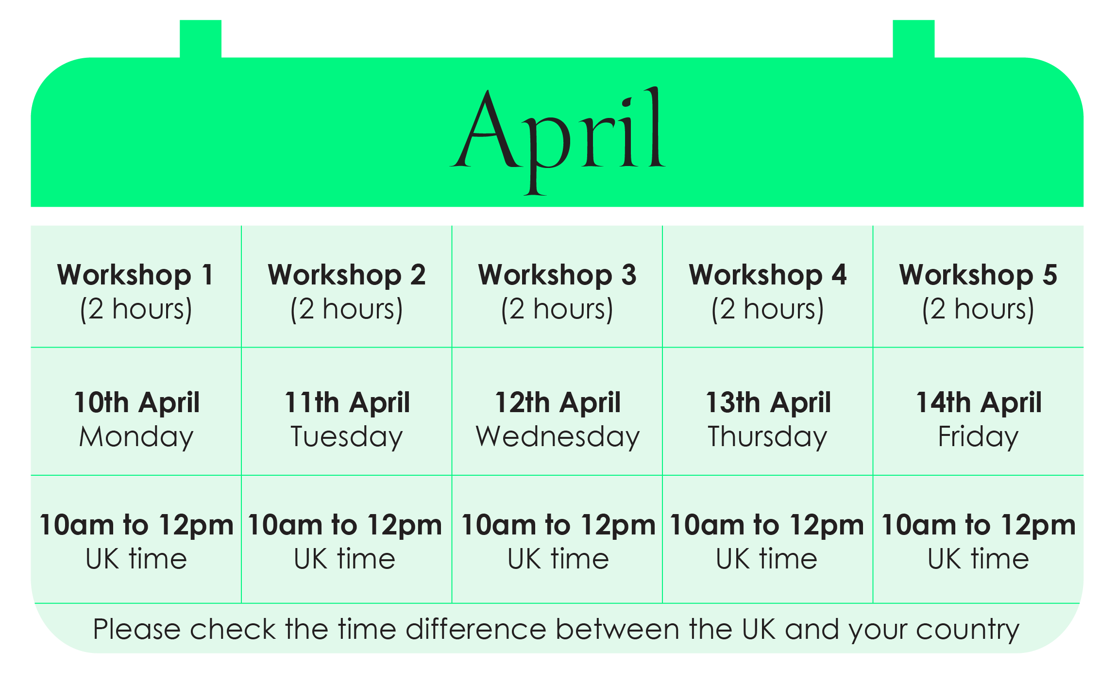 The training is divided into 5 workshops listed below. Each workshop is two hours in duration.